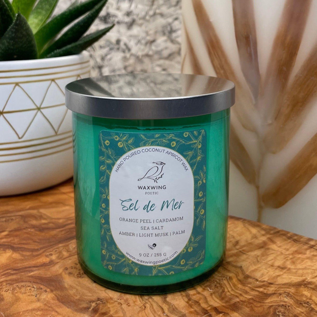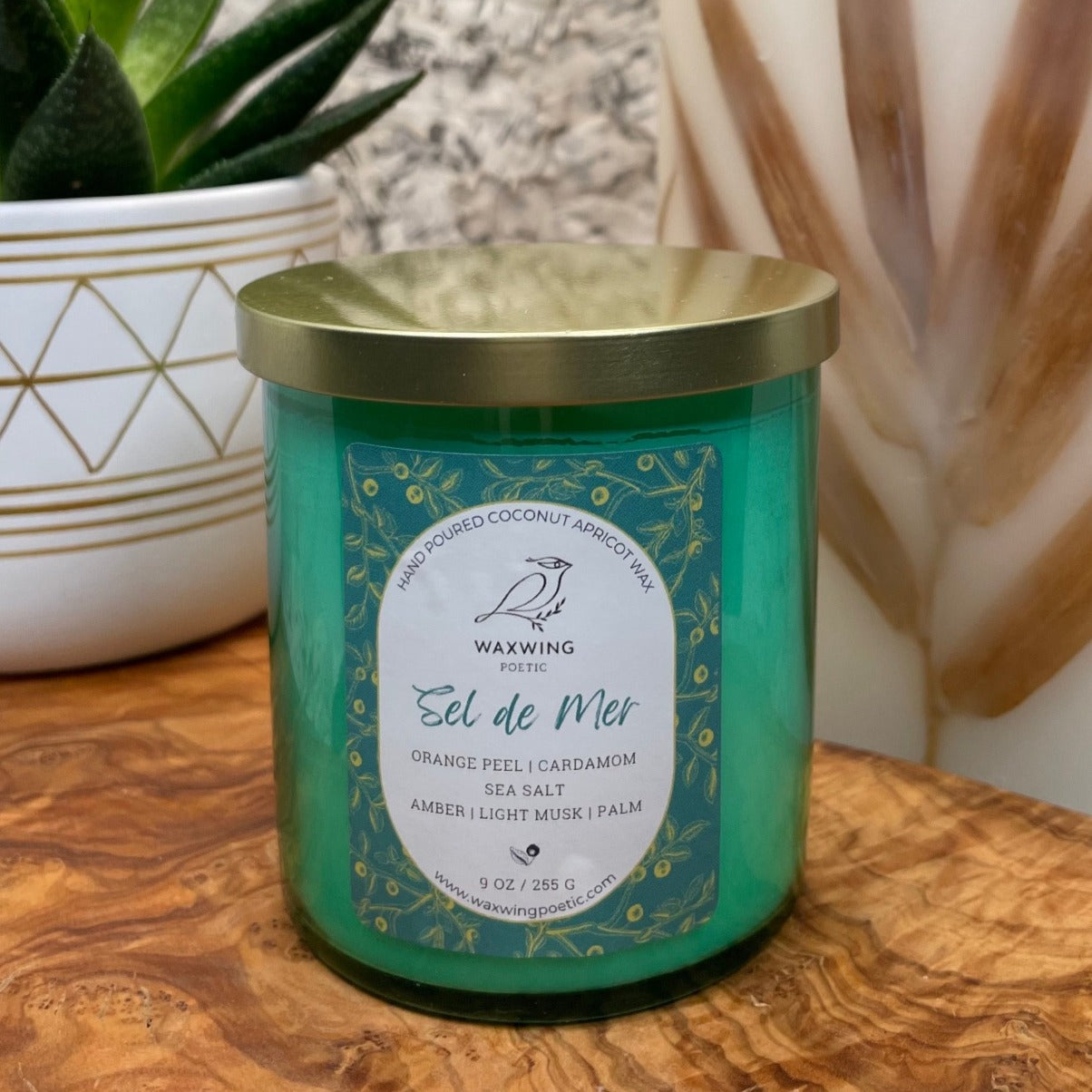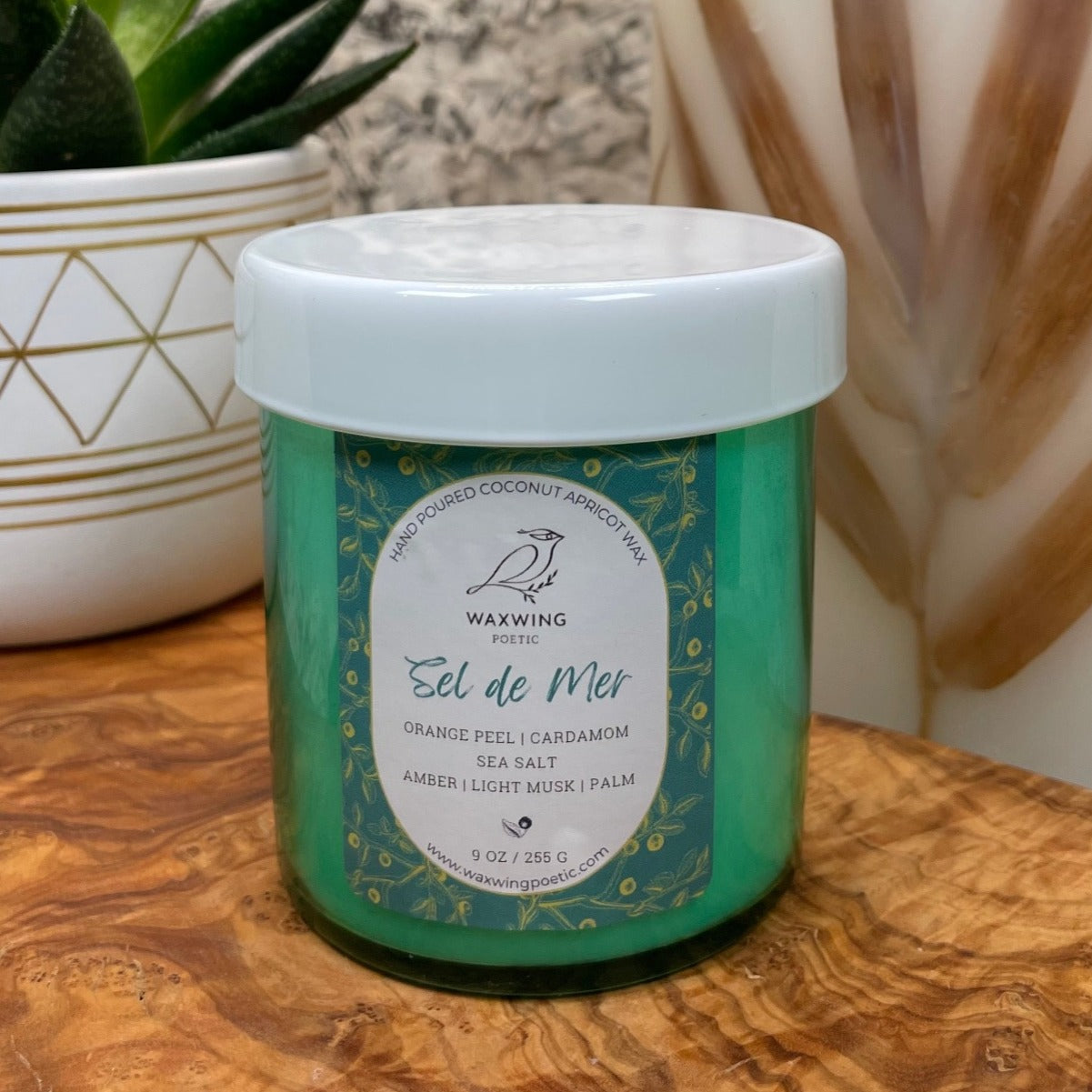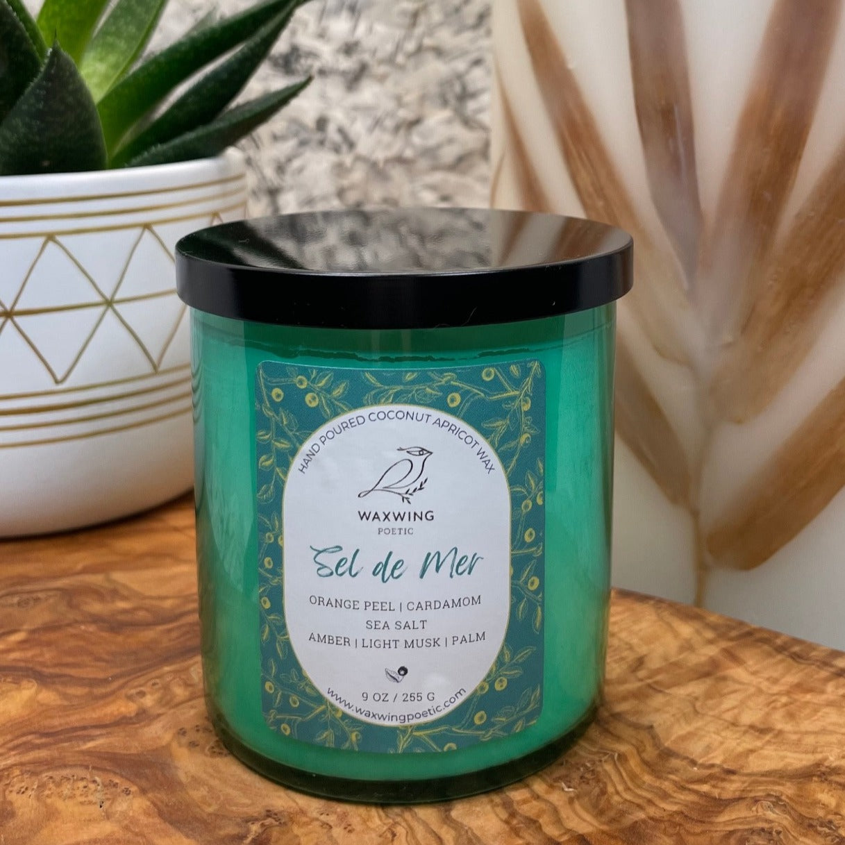 All WaxWing Poetic candles are hand-poured in our studio using clean-burning luxury coconut apricot wax. Soon after you light your candle you'll notice a difference in the way our coconut apricot wax burns in comparison to a large batch soy or paraffin wax candle. Coconut wax candles burn more slowly and softly and will have a longer burn time than a comparable paraffin wax candle.