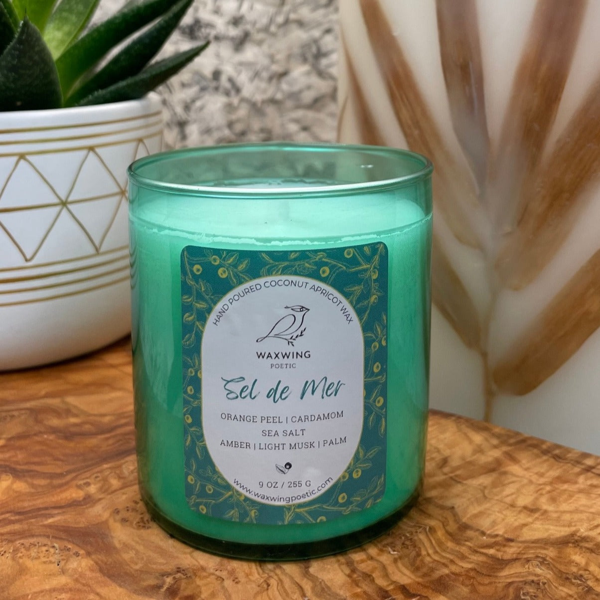 This upscale beach vibe candle brings to your space a fresh ocean breeze straight from the Cote d'Azur. Sel de Mer—a complex, mineral-rich French sea salt—is infused with cardamom, orange peel, palm, light musk, and amber. We hand pour our scented coconut apricot wax into a seafoam glass vessel, reminiscent of beach glass. What better way to transport you to a warm, sunny beach where you can dig your toes into silky white sand?